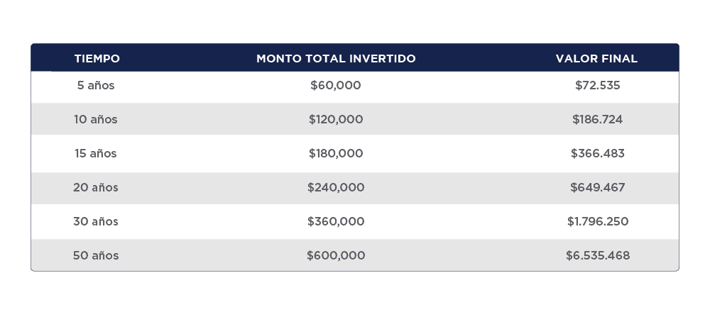 Teniendo esto en consideración, podemos simular un escenario donde usted invierte $1.000 todos los meses en el S&P 500 a una tasa de crecimiento anual compuesto del 9,5%, estos serían los resultados a lo largo de los años: