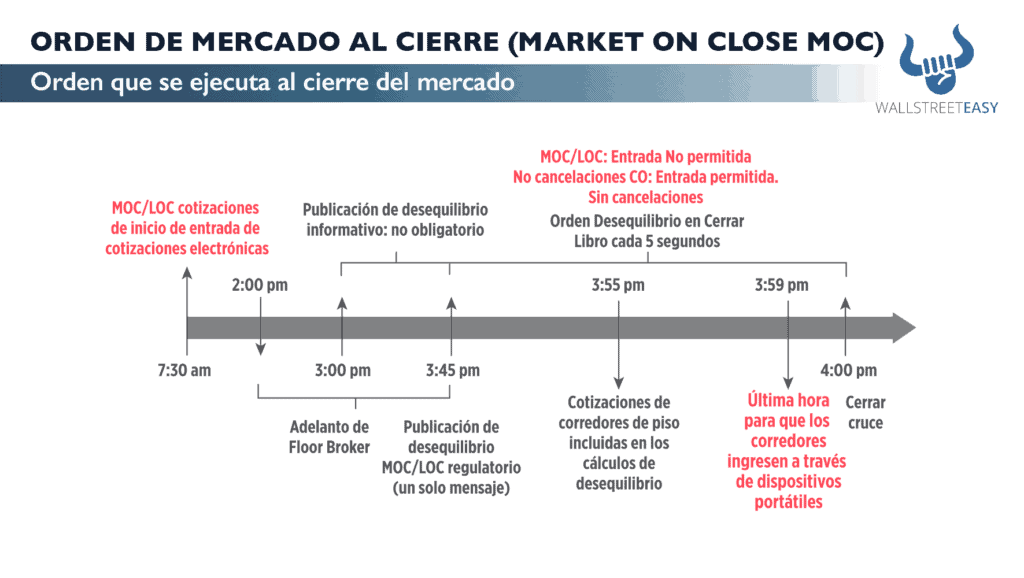 Es un tipo de orden de mercado que está programada para ejecutarse al cierre de la jornada de negociación, al último precio del día. Una vez que la orden MOC se activa, se comporta como una orden de mercado normal. El propósito de una orden MOC es obtener el último precio disponible de ese día de negociación. En el NYSE, los operadores deben enviar una orden MOC antes de las 3:45 pm EST, y en el Nasdaq antes de las 3:50 pm EST, ya que ambos Exchange cierran a las 4:00 pm EST.