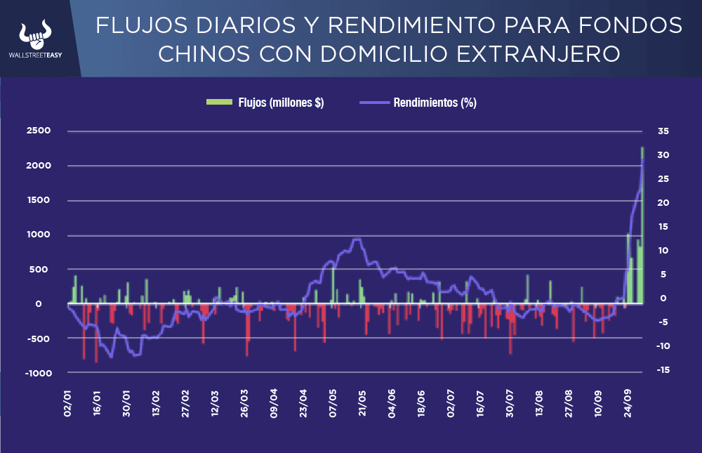 ¿ALGO MÁS? El cambio en los flujos de inversión de los inversores externos había sido extraordinario. Como demuestra Cameron Brandt de EPFR, los fondos internacionales dedicados a China habían sufrido constantes salidas de capitales; y luego, con el estímulo anunciado hace dos semanas, muchos decidieron que, después de todo, China era un país en el que se podía invertir.