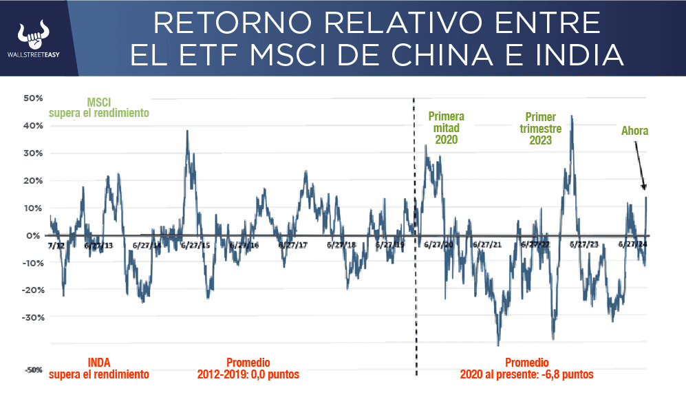 ¿OTRO DATO RELEVANTE? No es de extrañar que los inversores se quedaran en una situación de dos opiniones cuando los mercados se movieron lateralmente tras la conferencia de prensa. ¿El rally ya está perdiendo fuerza? Probablemente no. ¿QUÉ MÁS PASÓ? Para los responsables de las políticas, la velocidad y la escala de este rally invitan a comparaciones con el auge y caída de 2015. De febrero a junio de 2015, el CSI 300 subió más del +60%, luego se redujo casi a la mitad en los dos meses siguientes. ¿OTRO ACONTECIMIENTO? Es casi seguro que las autoridades quieren evitar que se repita ese doloroso episodio, que dañó la confianza del mercado, por lo tanto, las autoridades parecen estar dando los primeros pasos para frenar el entusiasmo. El año 2015 también fue testigo de una devaluación mal gestionada del yuan que llevó a los mercados internacionales al borde de la crisis. ¿OTRA NOVEDAD? La reacción de los inversores a la conferencia de prensa del presidente de la NDRC no fue tan comprensiva y muestra signos tempranos de impaciencia. La liquidación enfatizó que el apoyo fiscal complementario debe llegar antes, ya que cualquier demora indebida podría dañar la confianza. ES MÁS Los inversores ahora cambiarán su atención al Ministerio de Finanzas, que normalmente se encarga de emitir bonos para financiar medidas de estímulo y gasto adicional. El ministerio está listo para realizar una reunión informativa pronto que podría ofrecer el tipo de estímulo que los mercados quieren ver. ¿ALGÚN ACONTECIMIENTO ADICIONAL? Bloomberg News informa que los bancos, incluidos Morgan Stanley y HSBC Holdings Plc, esperan un estímulo de 2 billones de yuanes, mientras que Citigroup Inc. estima que la cifra será de 3 billones de yuanes. Otra decepción con expectativas tan altas podría ser muy perjudicial. PARA NO PERDER DE VISTA China está dominando una vez más la cartera de mercados emergentes, superando a la India. Los dos países representan casi la mitad del índice MSCI Emerging Markets, con una ponderación más alta de China (29,5% frente al 18,6%). POR ÚLTIMO Desde los anuncios de estímulo, las entradas de fondos a la India han sido solo el 1% de los flujos hacia fondos equivalentes de China, según EPFR. Utilizando datos de retorno relativo de 100 días para MCHI (MSCI China ETF) e INDA (MSCI India), destaca el auge de China.