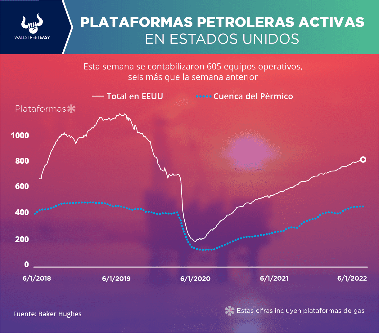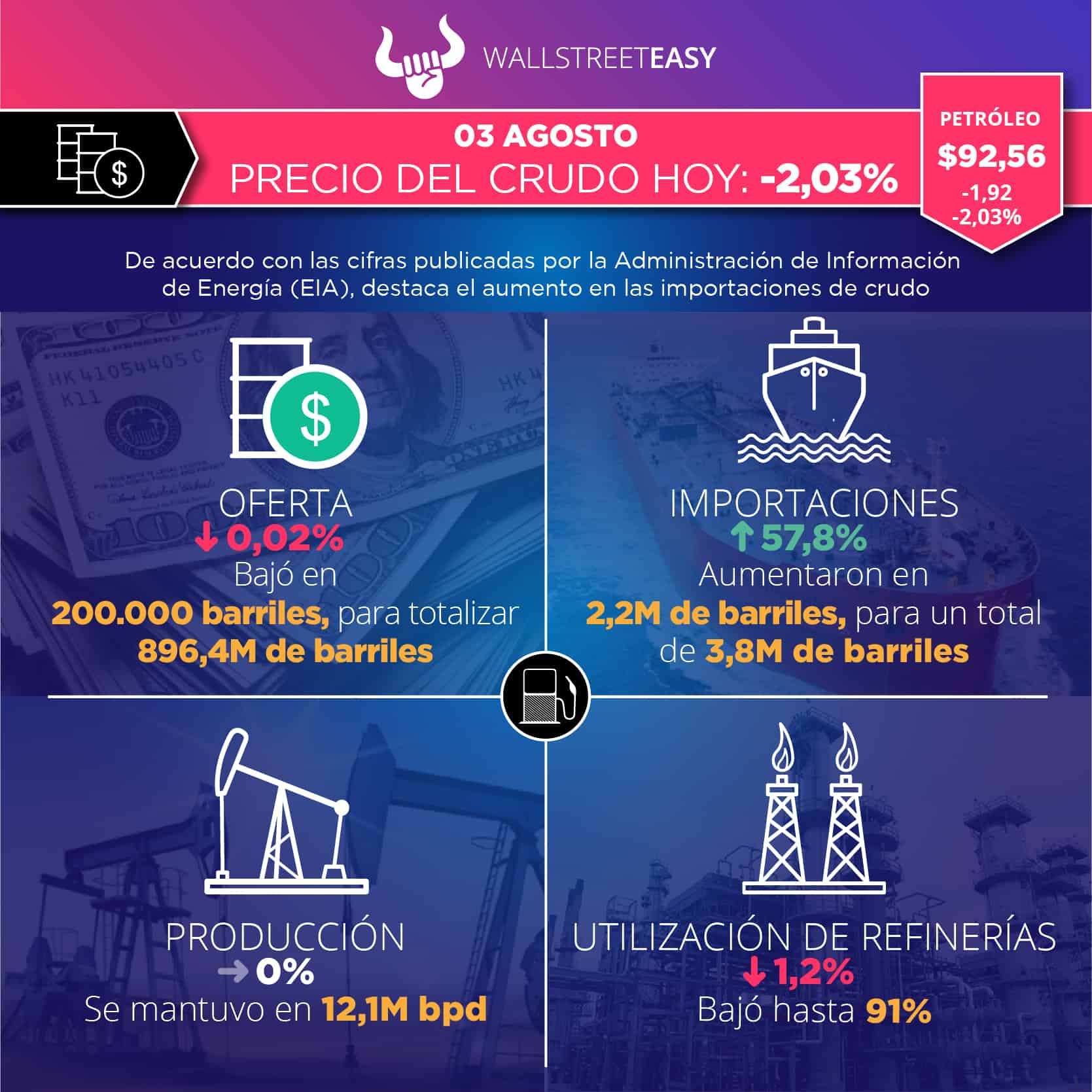 EIA, por sus siglas en inglés) reportó 896,4M de barriles en existencias de crudo, tanto comerciales como estratégicas, lo que representa una baja de 200.000 barriles. El Instituto Americano del Petróleo (