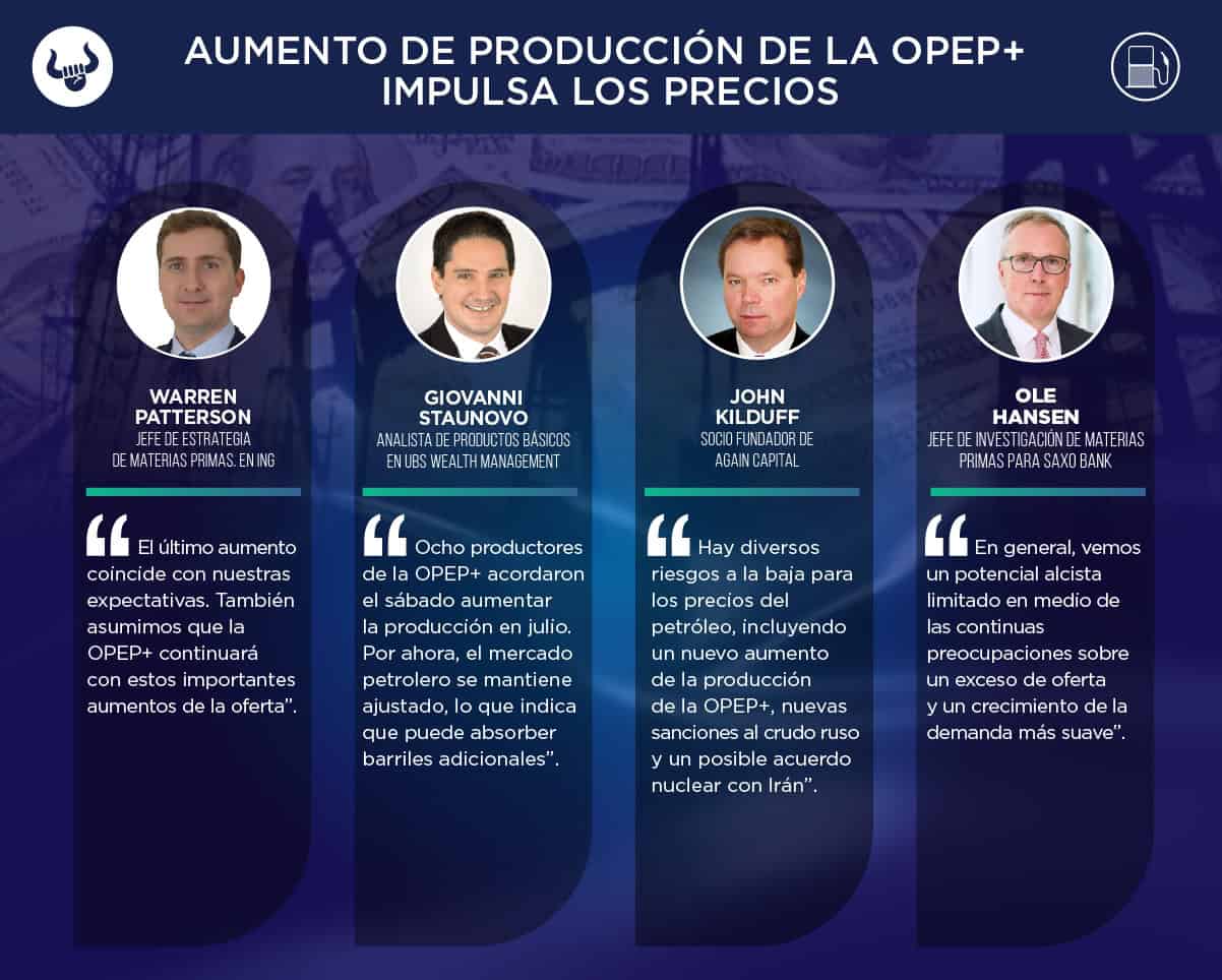 - Los ocho países de la OPEP+ que han comenzado a reducir su producción voluntaria de 2022 acordaron otro aumento de 411.000 bpd para julio, el tercer mes consecutivo de aumentos acelerados, con lo que recuperan el 62% de sus antiguos recortes.