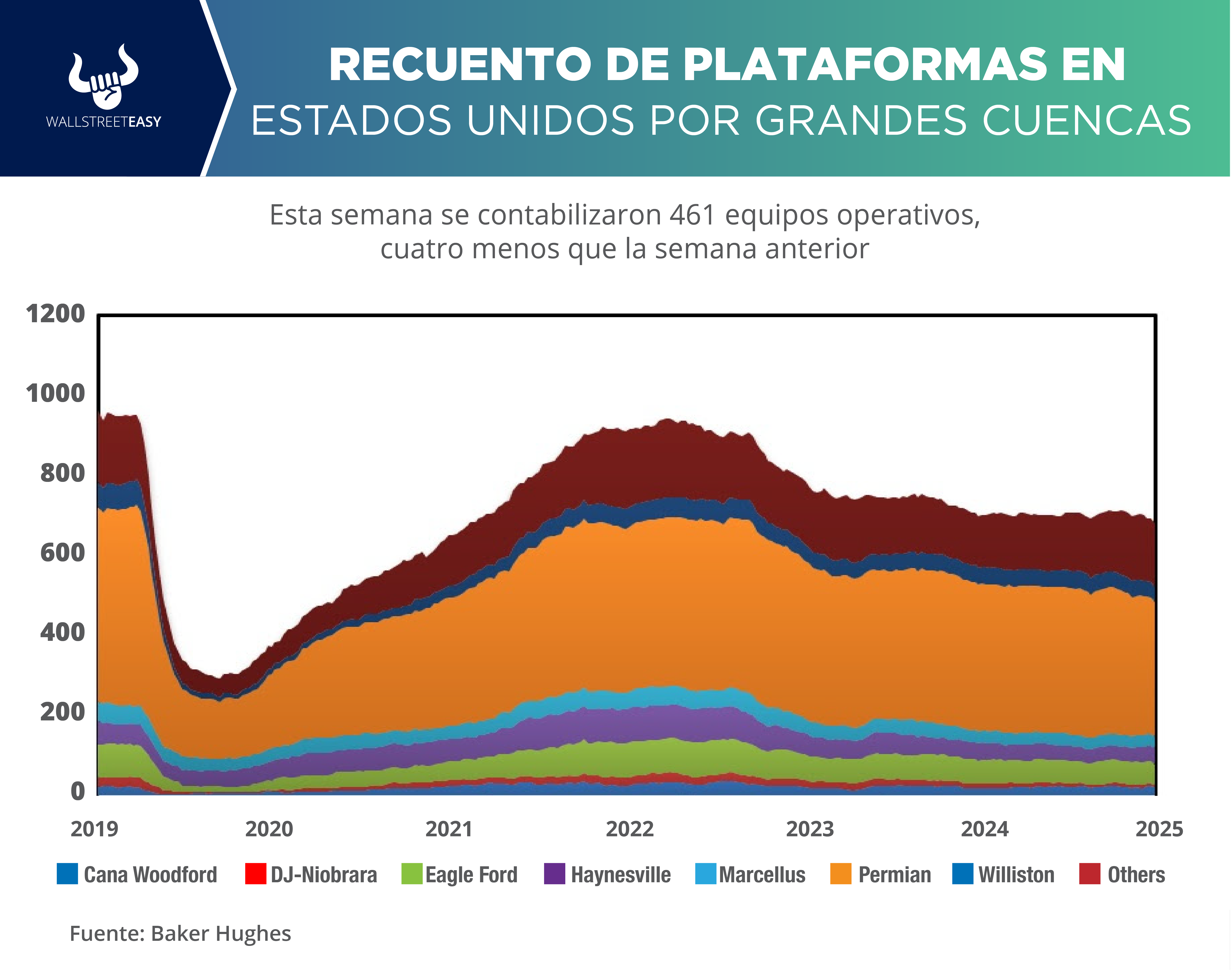 Baker Hughes, actualmente en EEUU se encuentran 563 equipos activos (incluyendo los de gas). En la actividad petrolera se contabilizaron 461, cuatro menos que la semana anterior. En las operaciones de gas hay 99 equipos operativos, uno más que hace siete días. Hace un año estaban activas 600 plataformas.
