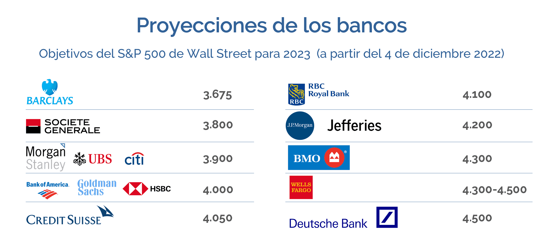 Según números de la consultora TKer hasta el 4 de diciembre de 2022, las principales entidades financieras están siendo bastante precavidas con los objetivos para el S&P 500 en 2023: