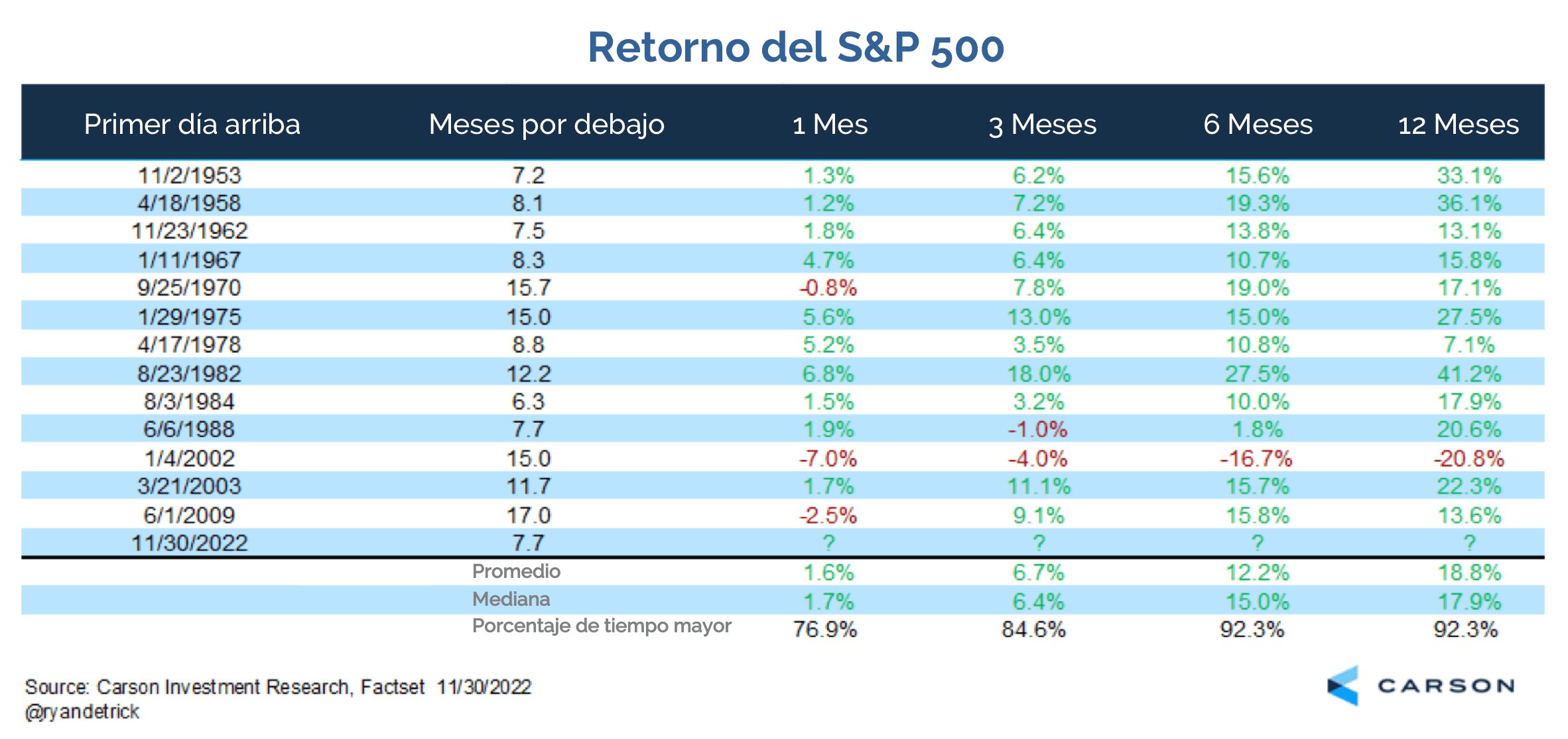 En octubre de 2022, después de siete meses, el retorno del S&P 500 logró cerrar arriba del promedio móvil de 200 días. Generalmente, cuando esto sucede a pesar de lo que perdió en diciembre, tiende a hacer una señal de muy buenos retornos en los siguientes 12 meses.