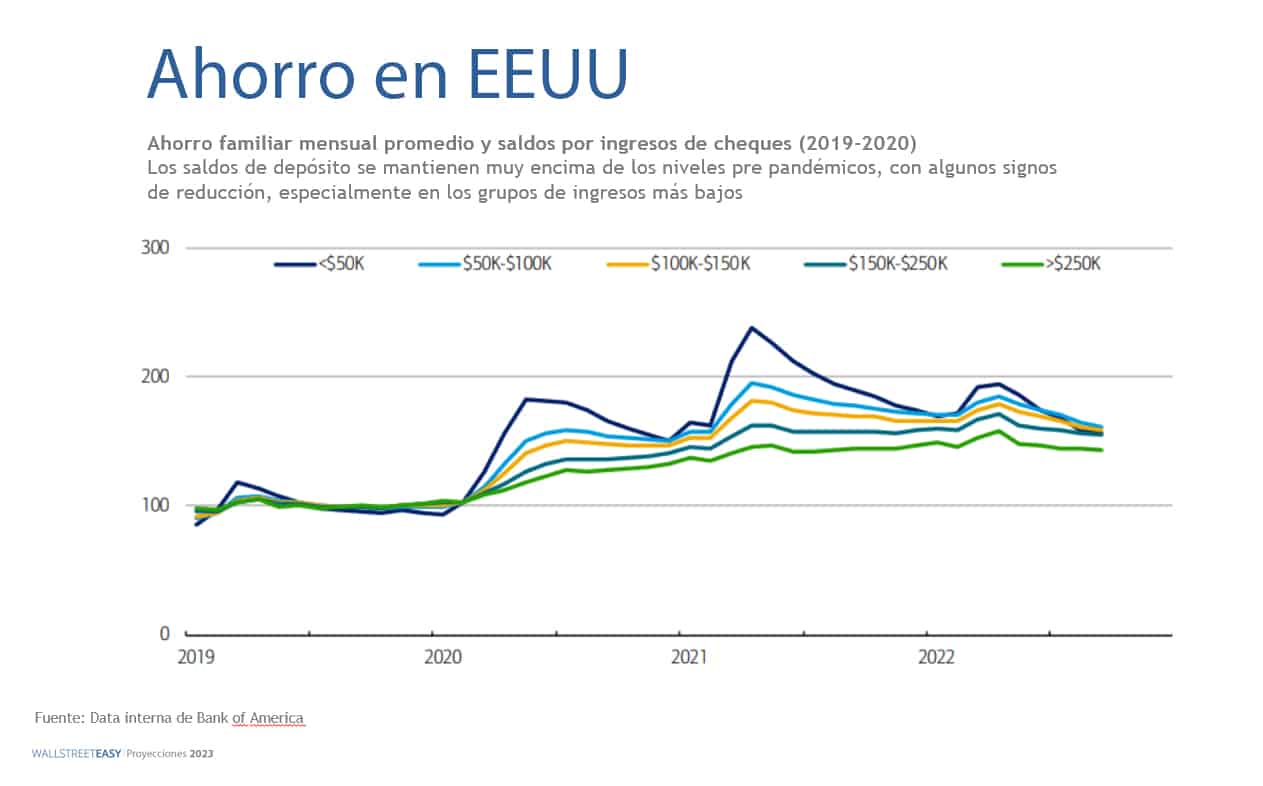 Hay que tener en cuenta que buena parte del consumo se debió a los ahorros de las personas tras los incentivos durante la pandemia. Según Bank of America, se vienen reduciendo, pero no se encuentra en una situación alarmante. Los ahorros serán determinantes e importantes para el consumo en EEUU.