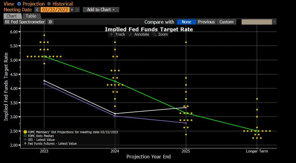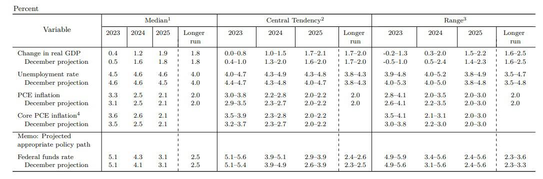 Las proyecciones de la FED se mantuvieron prácticamente iguales que en diciembre, con un ligero aumento en su expectativa de inflación. Las tasas de interés se mantienen idénticas para 2023, pero reducen la cantidad de recortes esperados. Esto parece que la FED hace un esfuerzo para no mover nada, mientras espera ver el efecto de la situación actual en la economía.