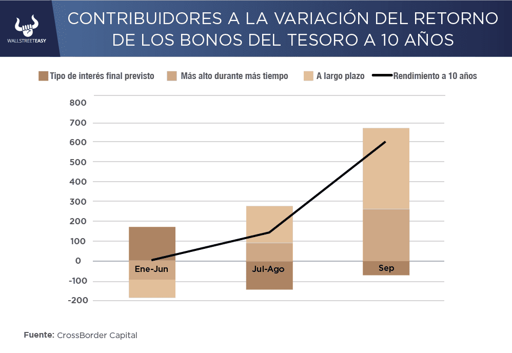 El esquema de Michael Howell de CrossBorder Capital da la intuición detrás de esto. El rendimiento de un bono a largo plazo se puede dividir entre la tasa terminal esperada y algo adicional para compensar el riesgo de invertir por más tiempo. Si existe la expectativa de que las tasas de interés se mantendrán altas durante más tiempo, eso también aumentará el rendimiento. Lo que queda es la prima por plazo. Esta es su versión: