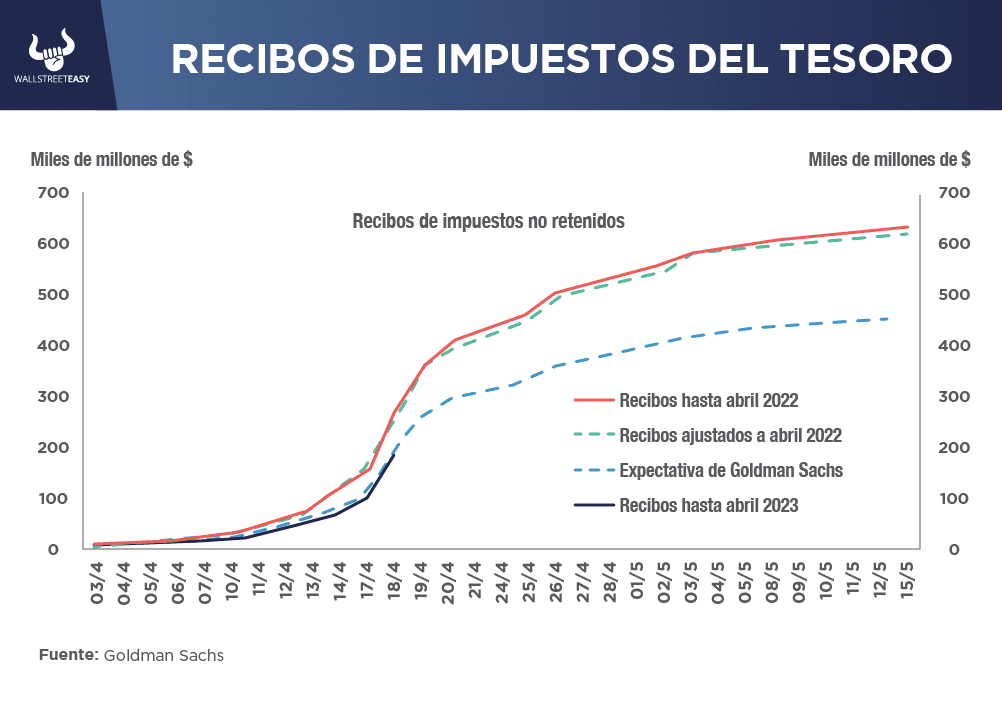 Los recibos de impuestos son vitales para el intento del Tesoro de mantenerse dentro de su límite actual. Cuanto más ingrese, más tiempo puede esperar hasta pedir prestado más. El “Día de los impuestos” acaba de pasar, y en este punto, la admisión parece decepcionante. Según Goldman Sachs, los recibos de abril están -29% por debajo de su nivel de abril de 2022.