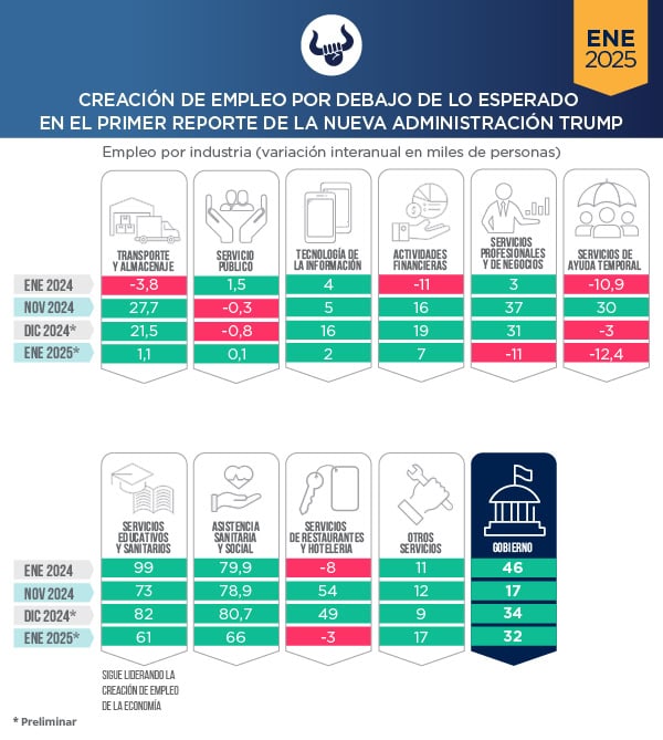 La economía estadounidense comenzó 2025 añadiendo 143.000 puestos de trabajo en enero, menos de los 170.000 esperados por los analistas. A la vez se registró más inflación relacionada con empleos, con una subida de 0,5% en el mes y 4,1% anualizado, lo cual es más de lo esperado y más que los meses previos.