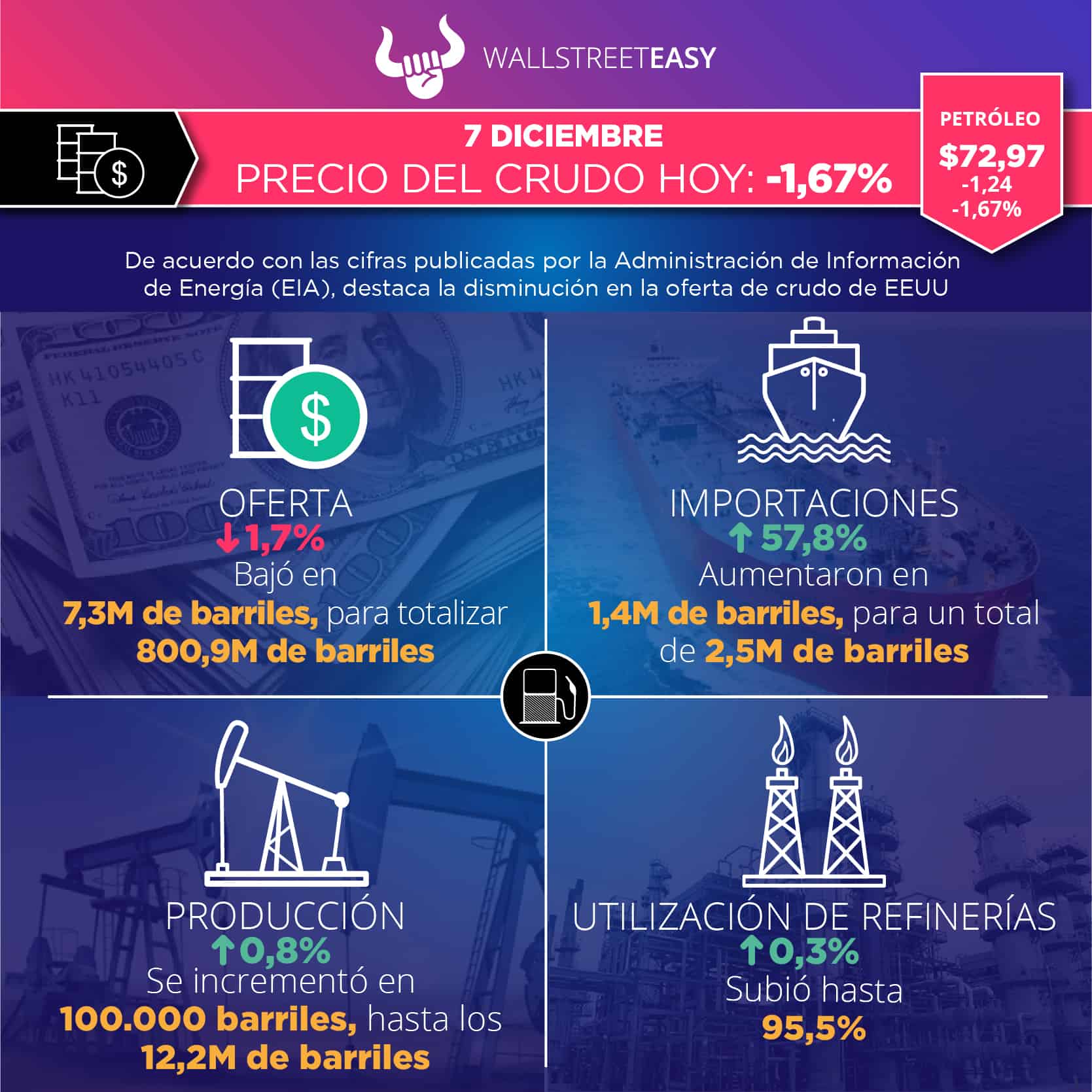 Al cierre de esta edición, el precio del barril subió hasta $72,97, lo que representa -1,67% en comparación con el día martes.