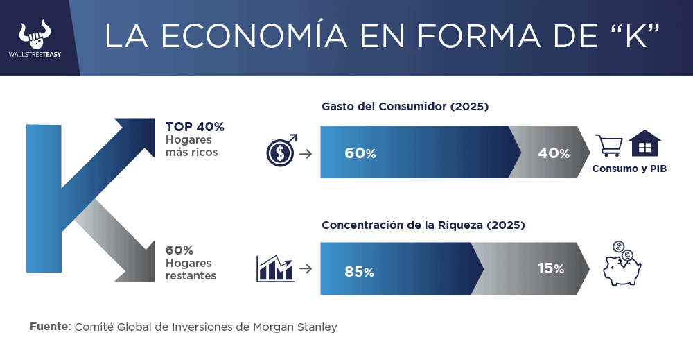 DAME CONTEXTO Dadas estas ya elevadas valoraciones, la pregunta es qué podría sostener el impulso del mercado a partir de ahora y de dónde podrían provenir las ganancias adicionales. Para responder a estas preguntas, es crucial comprender la actual "economía en forma de K", una circunstancia en la que diferentes segmentos de consumidores e industrias crecen a ritmos drásticamente divergentes. ¿ENTONCES? En este escenario, las personas con mayores ingresos ven crecer su riqueza a través de las inversiones, constituyendo la parte superior de la "K", mientras que los individuos de menores ingresos luchan, formando la parte inferior. De manera similar, industrias como la tecnología, especialmente aquellas relacionadas con la Inteligencia Artificial (IA), están en auge, mientras que otros sectores se quedan atrás. ¿ALGO MÁS? El 40% de los hogares con mayores ingresos, la cima de la "K", representa el 60% de todo el gasto del consumidor, que a su vez impulsa gran parte del crecimiento económico de EEUU. Estos hogares también controlan casi el 85% de la riqueza del país.