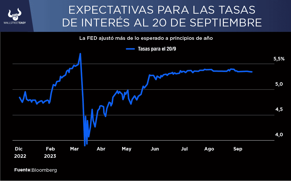 Pero la Reserva Federal ha realizado dos aumentos más de los previstos a principios de año. Excluyendo un breve repunte inmediatamente antes de las quiebras de los bancos regionales de marzo, las expectativas sobre las tasas son más altas que nunca.