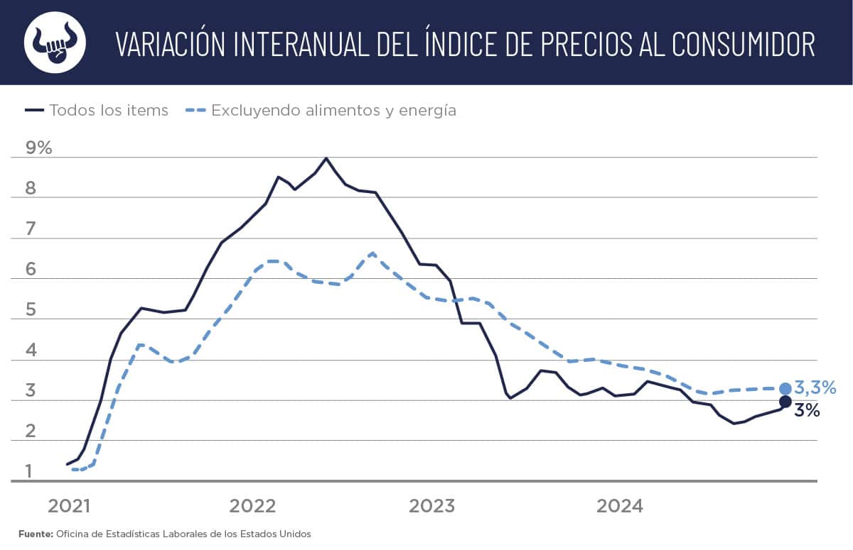 Los resultados de inflación en Estados Unidos sorprendieron al mercado con cifras superiores a las esperadas. La inflación mensual se situó en 0,5%, superando la expectativa del 0,3%. De manera similar, la inflación núcleo mensual alcanzó 0,4%, cuando se esperaba 0,3%. En términos anuales, la inflación general y la núcleo se ubicaron en 3% y 3,3% respectivamente, ambas por encima de las proyecciones.