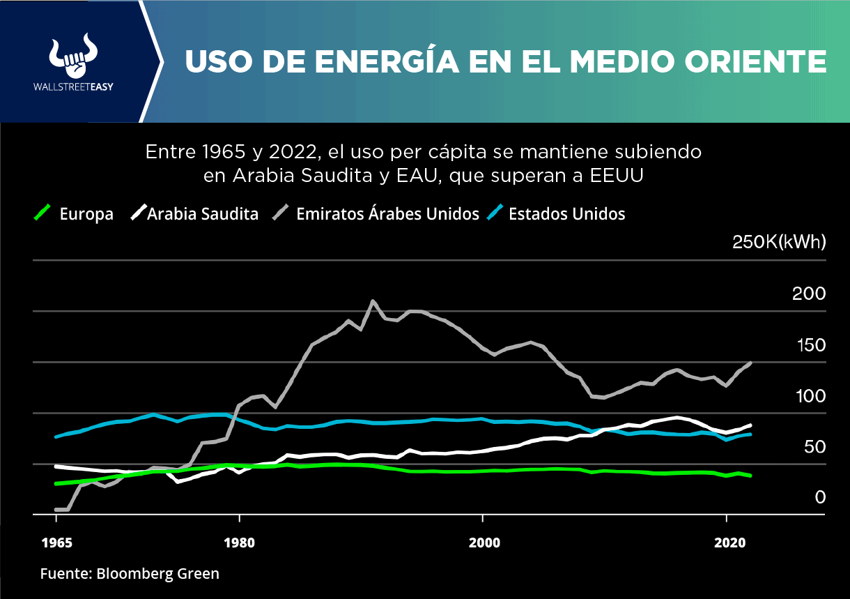 - En el propio Medio Oriente, la transición energética es un sueño lejano, ya que apenas el 1% de la generación de energía en Arabia Saudita, Catar u Omán procede de fuentes renovables. Incluso en los Emiratos Árabes Unidos, el porcentaje es de solo el 7%.