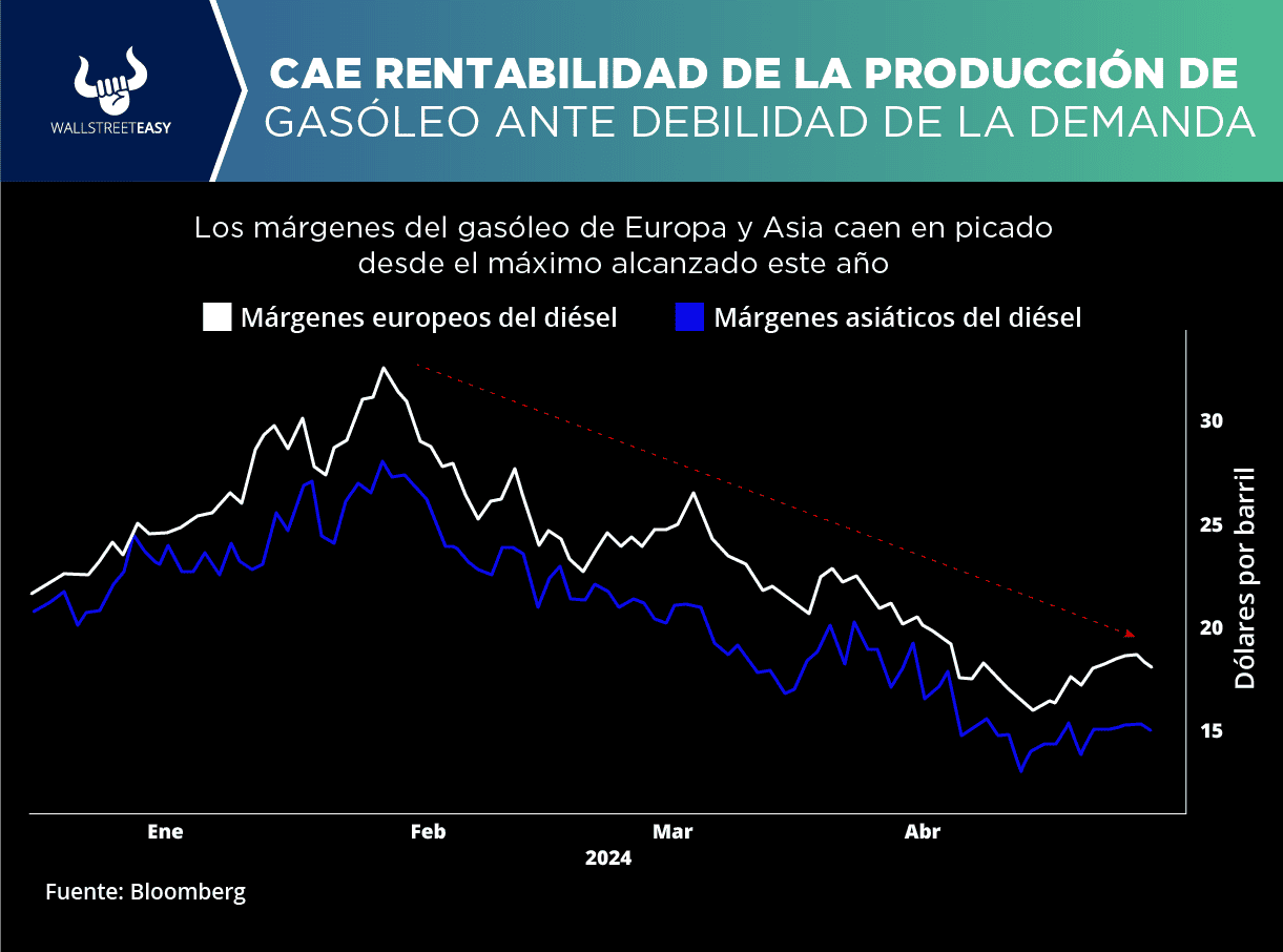 El aumento de la oferta de gasóleo está mermando los precios de los destilados intermedios, y la rentabilidad de su producción se ha reducido a la mitad en comparación con los niveles máximos de febrero de este año, lo que ha provocado recortes de la producción en Europa y Asia: