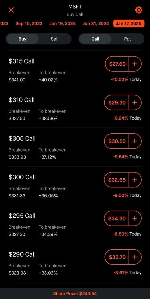 Veamos un ejemplo: compramos Calls de Microsoft con un precio de ejercicio de 300 a enero 2025, los cuales cotizan a en $31,33 cada contrato, entonces en lugar de pagar $24.354 por 100 Acciones a $243,54 cada acción, podemos controlar esa misma cantidad por $3.133, menos de 10% del valor.