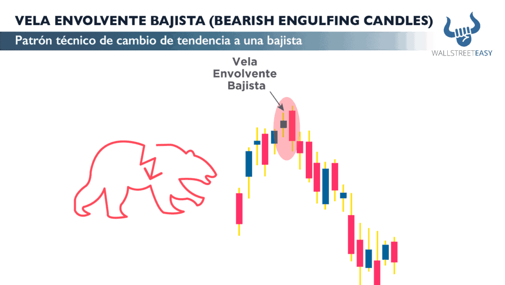 Es un patrón utilizado en el análisis técnico en el que se observa una primera vela verde en una tendencia alcista, seguida de una gran vela roja cuyo cuerpo “envuelve” por completo a la vela anterior.