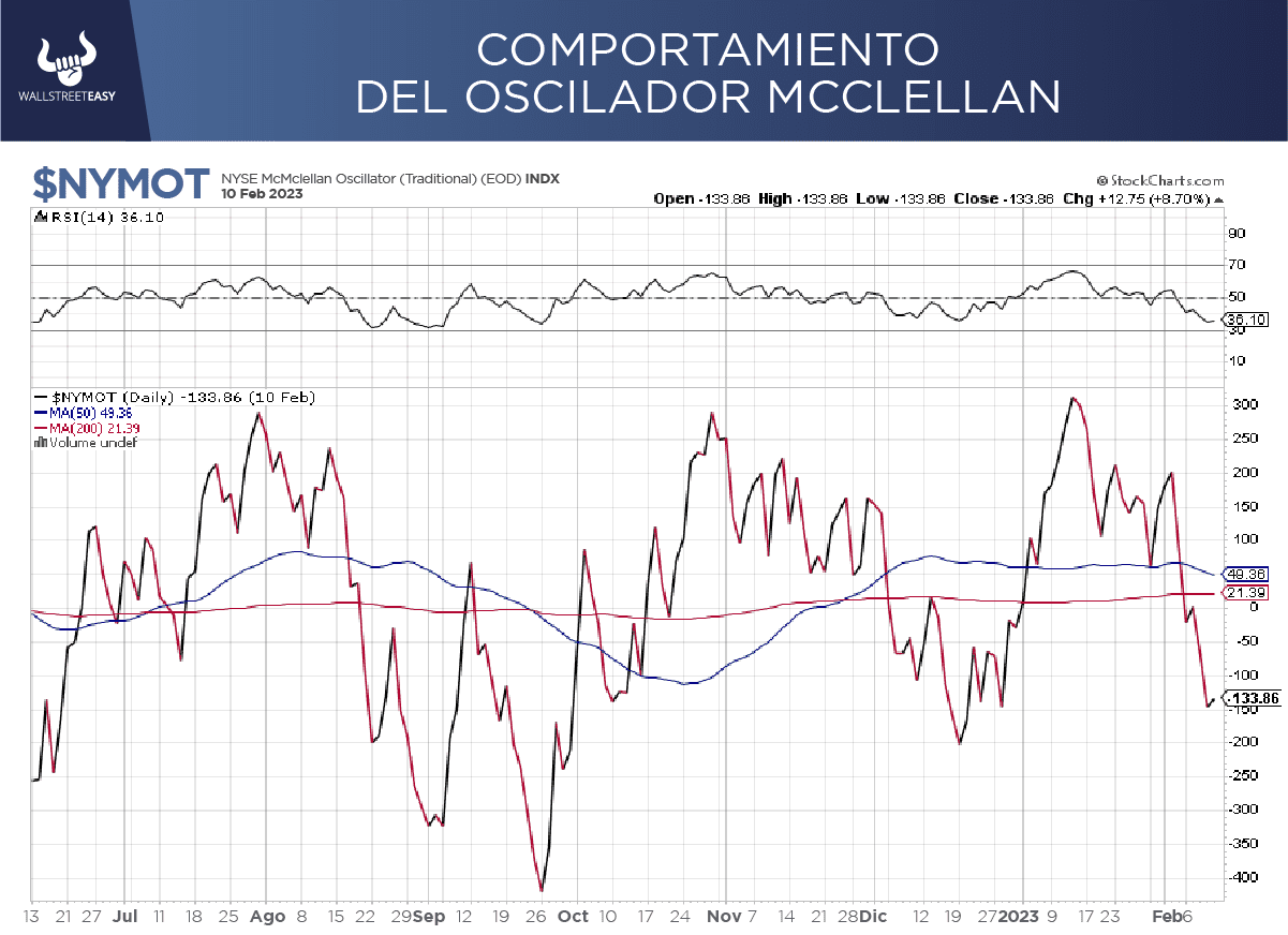 Lo positivo para el mercado es que el índice de inercia McClellan empieza a llegar a niveles donde en otros momentos ha significado el fin de la lectura de sobrecompra, y ha traído nuevos rallys.